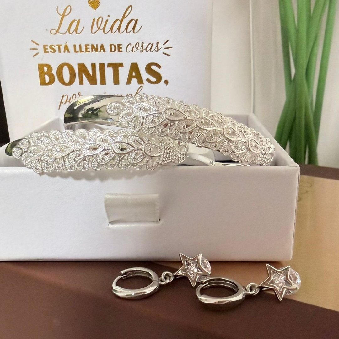 El brazalete Elegancia Real, esta fabricado con Plata de primera ley y acero de alta calidad. Todos nuestros productos son hipoalergénicos y libres de níquel, plomo y cadmio, garantizando una experiencia segura y cómoda.