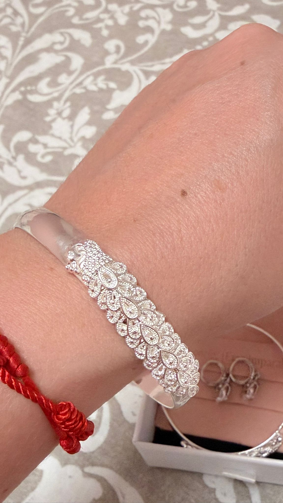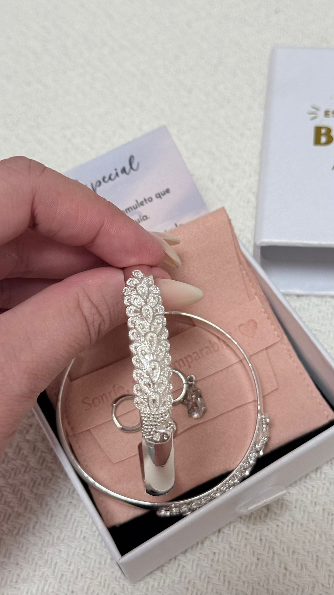 La pulsera es aún más bonita en persona. Tiene un acabado muy fino y los detalles tallados se ven espectaculares. Me encantó la presentación, se nota que lo preparan con mimo